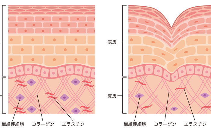 真皮のシワは、紫外線によって「コラーゲン」や「エラスチン」などがダメージを受け、表皮を支えきれなくなることで起きます。